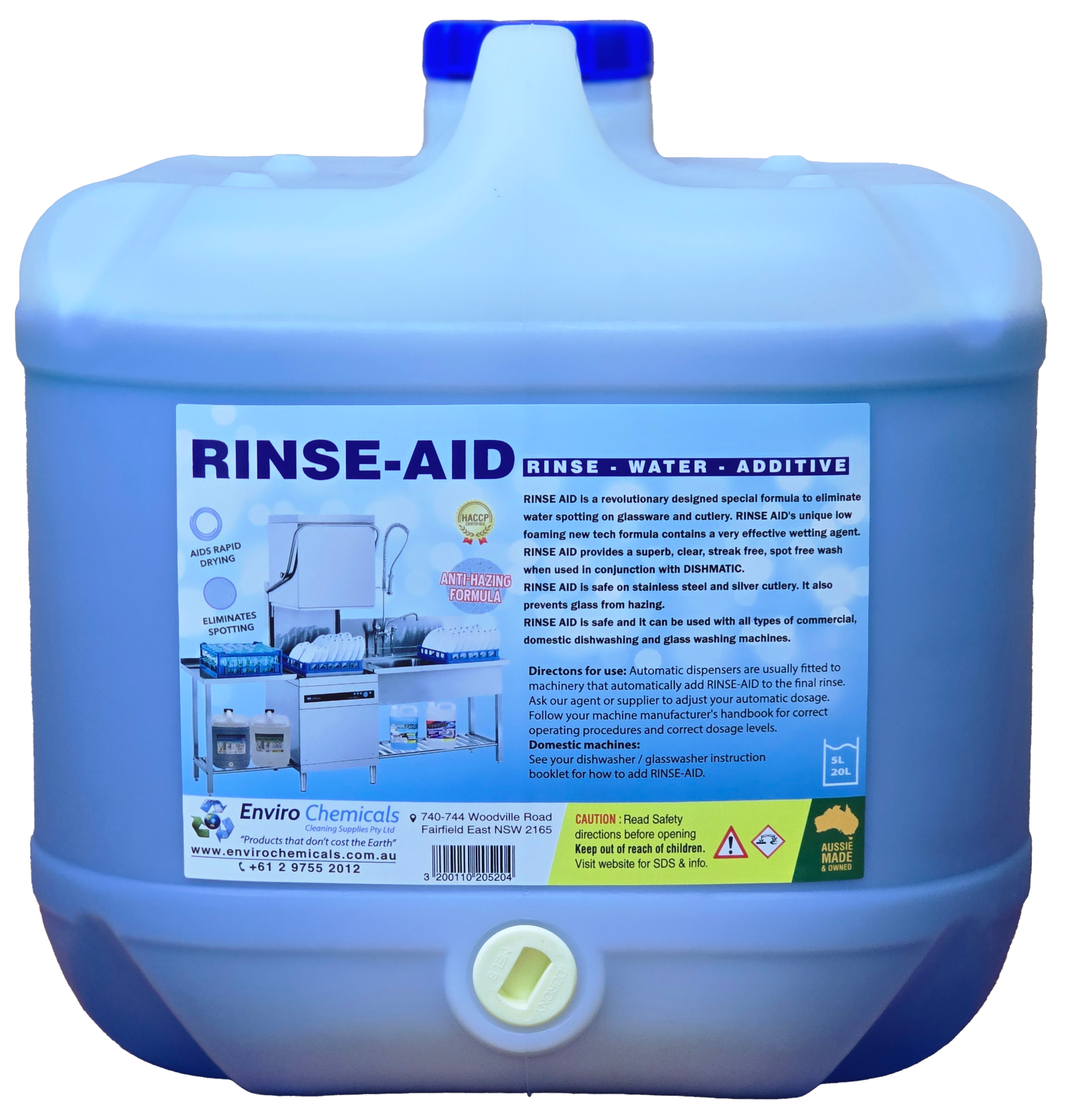 MACHINE RINSE AID ENVIRO RINSE AID SupaDry is a revolutionary designed special formula to eliminate striking, water spotting on glassware, crockery and cutlery. ENVIRO RINSE AID’s unique Environmentally friendly low foaming new tech sanitising formula has a built-in descaler and contains a very effective water softening and wetting agent. ENVIRO RINSE AID provides a superb, clear, streak free, spot free wash when used in conjunction with ENVIRO DISHMATIC. ENVIRO RINSE AID is safe on stainless steel and silver cutlery. It also prevents glass from hazing. ENVIRO RINSE AID is safe and it can be used with all types of commercial, domestic dishwashing and glass washing machines.